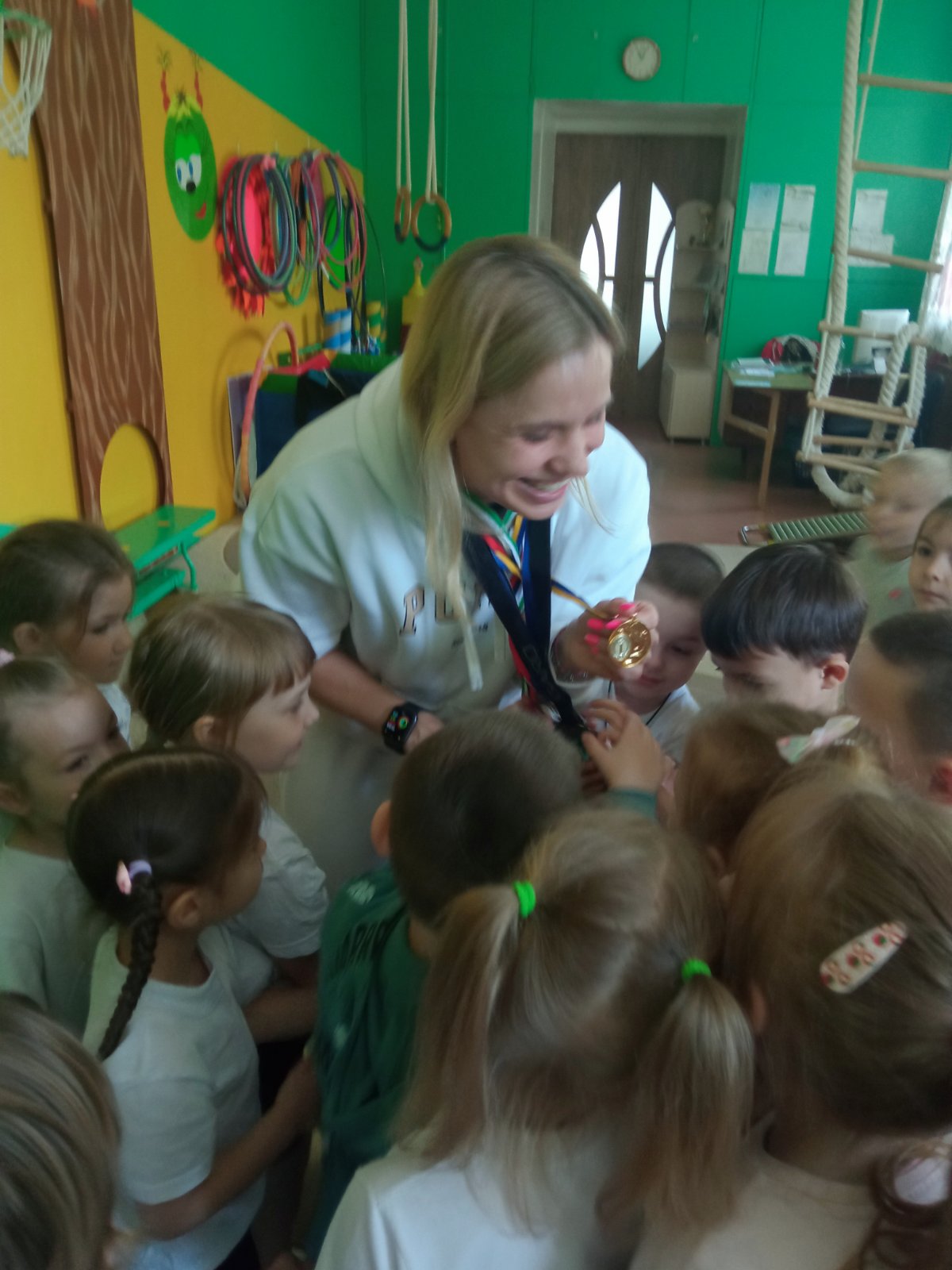 Дошкільники взяли участь у челенджі #шкільні_ігри_єднають_громади #DoLikeOlympians до малят завітала учасниця олімпійських ігор, майстер спорту міжнародного класу, призер чемпіонатів Європи, Рекордсменка України з плавання, тренер ск. Олімп Джеркаль Анна Леонідівна. На зустрічі Анна Леонідівна розповіла про свої досягнення та показала свої нагороди. Спортсменка разом з дітьми виконала рухану.