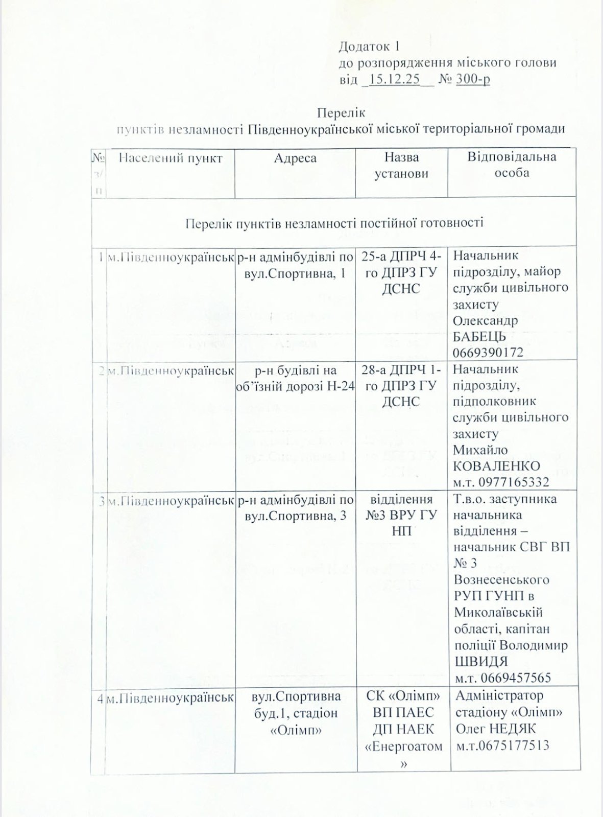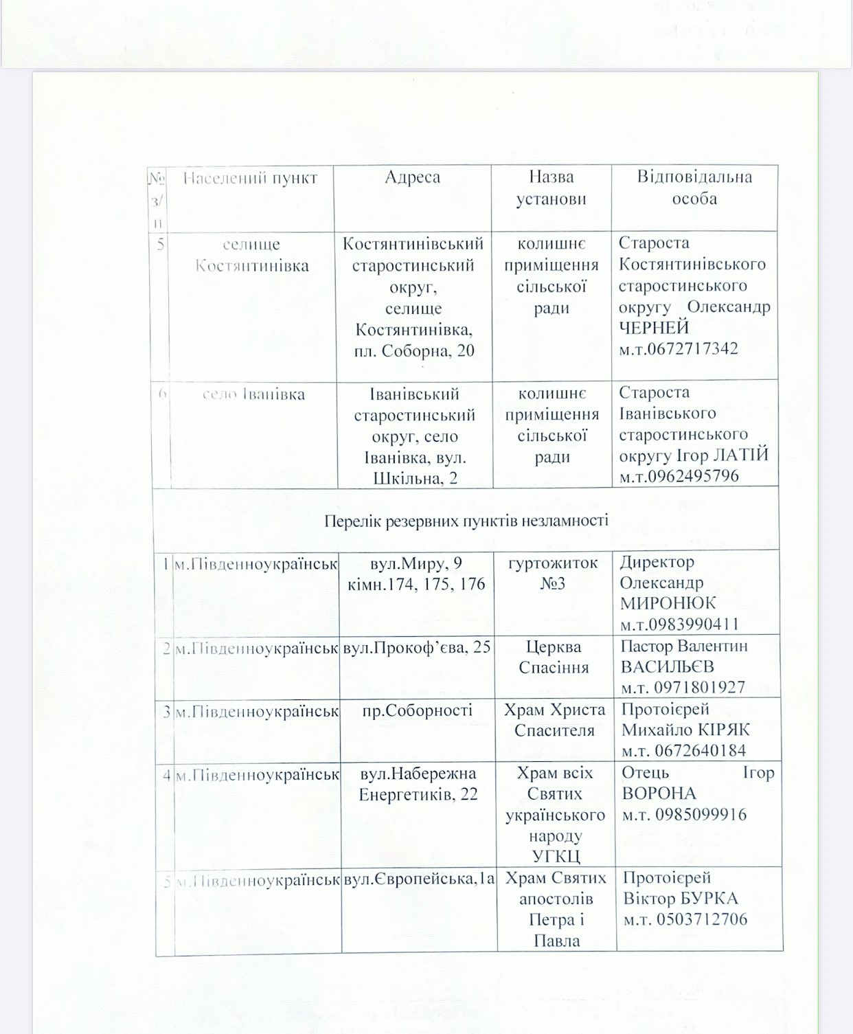 Перелік пунктів незламності Південноукраїнської міської територіальної громади